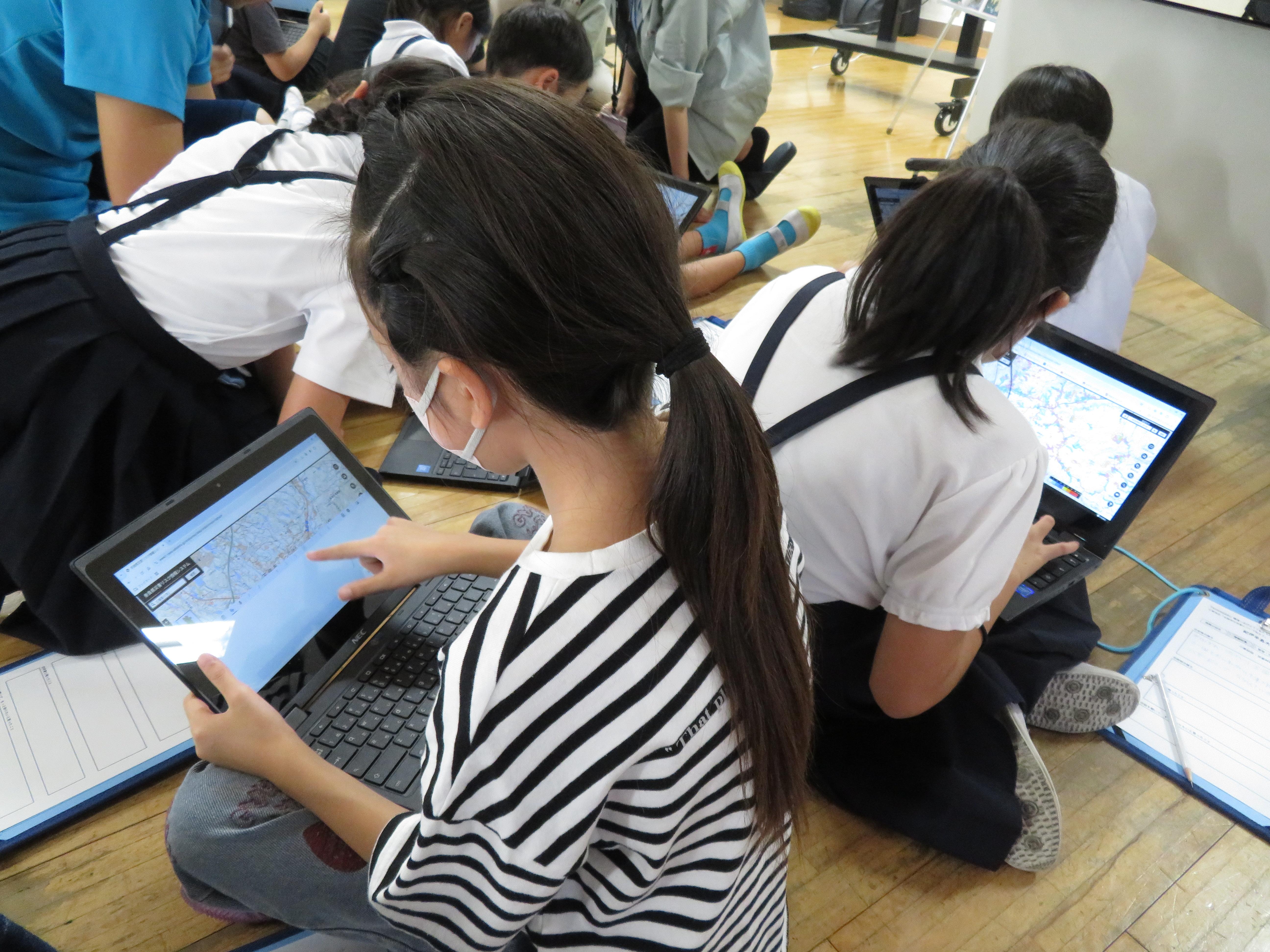 「奈良県災害リスク情報システム」という、インターネットで災害リスク情報の調べ方も教えていただき、実際にタブレットで小学校や家の周りを確認してみました。