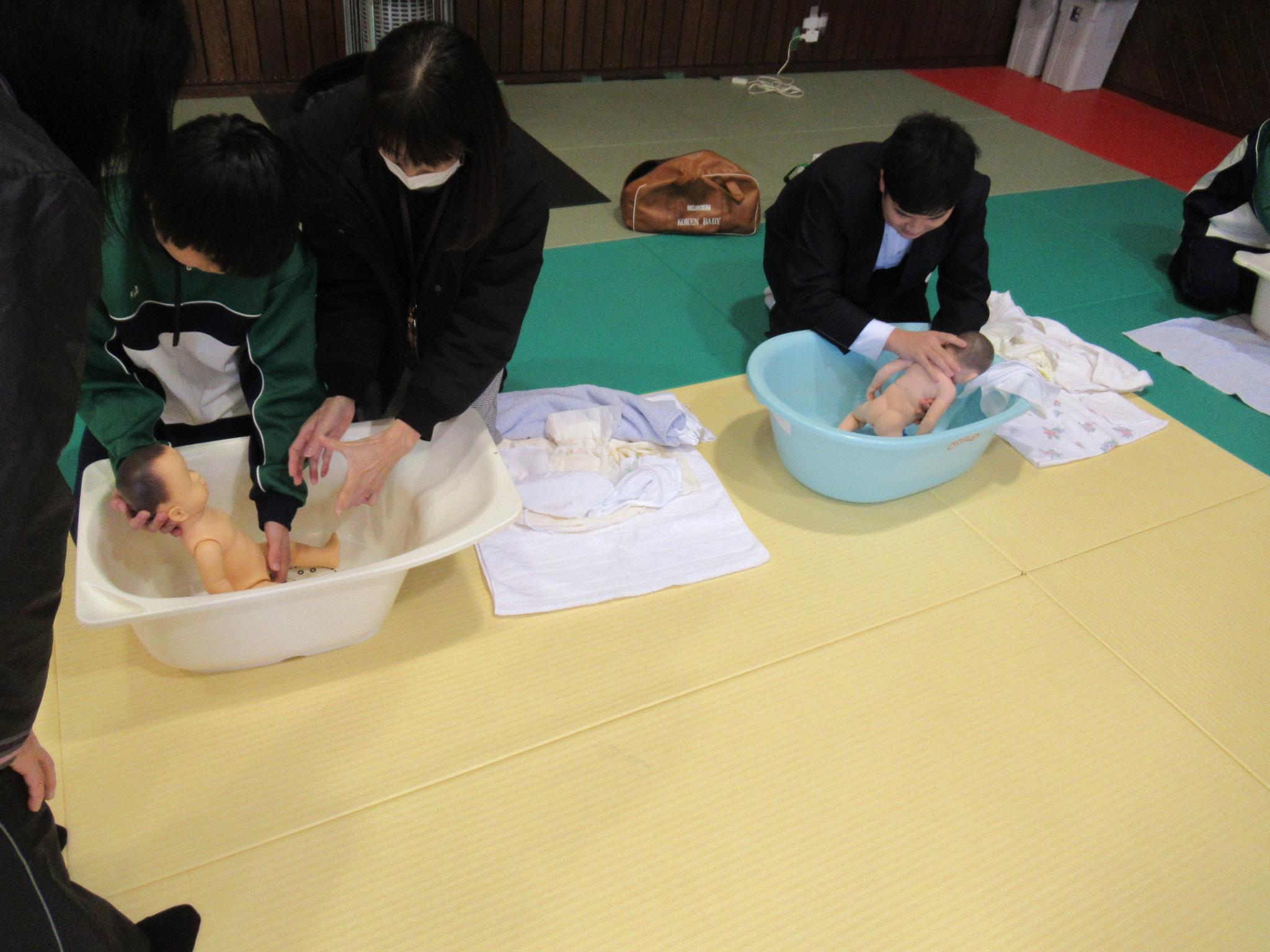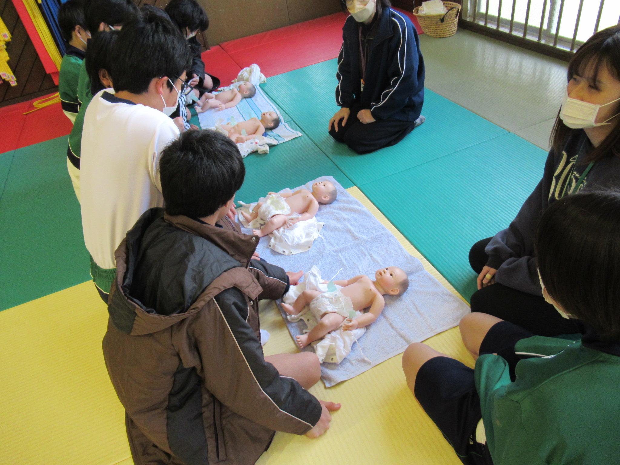 その後、妊婦体験・胎児のようす・沐浴体験・オムツ変え体験・抱っこ体験の5つのブースに分かれてこれからの生活で経験するかもしれない。大切な経験をすることができました。